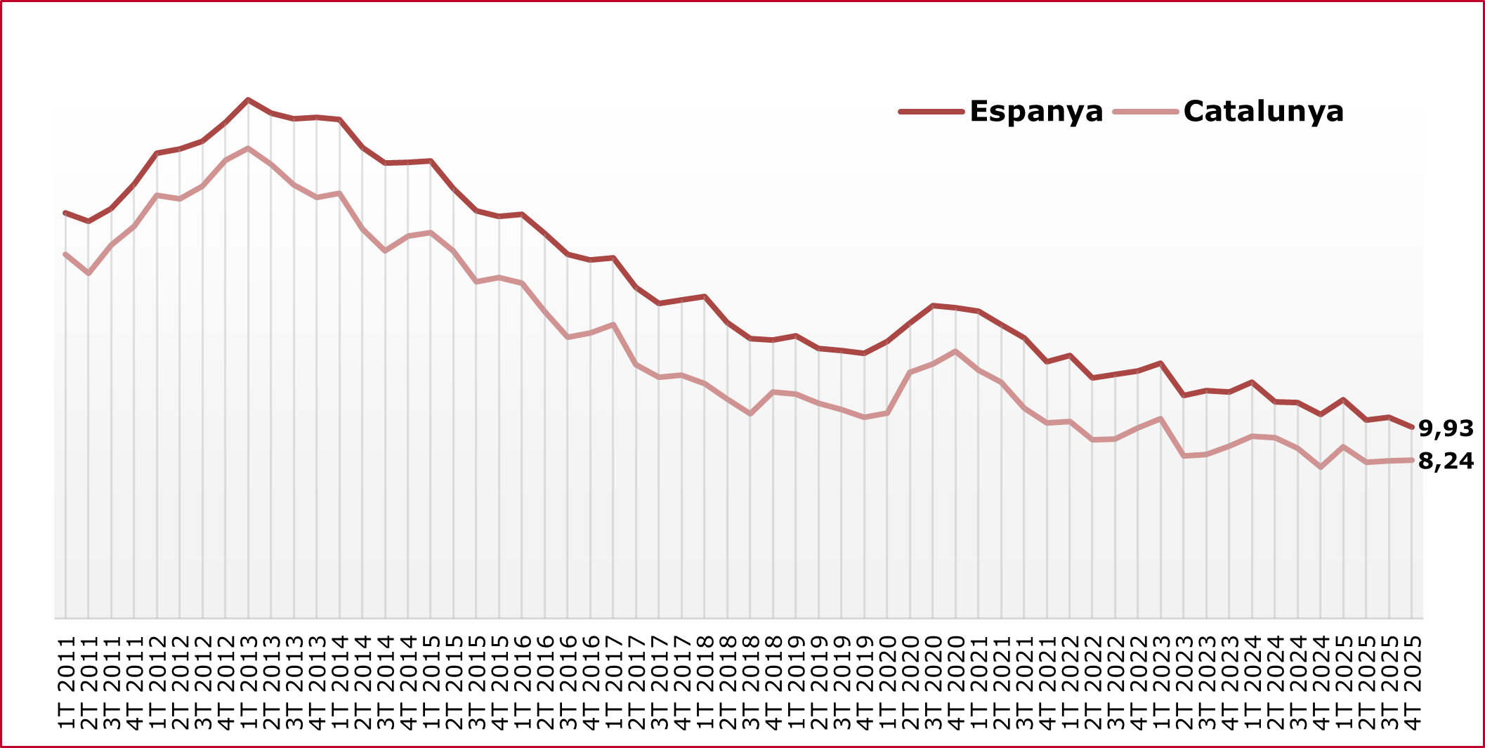 En Catalunya, el número de desempleados según la Encuesta de Población Activa del 4º trimestre de 2025 sitúa la tasa de paro en Catalunya en un 8,24% (0,06 puntos más que el trimestre anterior, que fue del 8,18%) situando el número total de parados en 351.200 personas. Interanualmente, el empleo se ha incrementado en 57.300 personas (1,49%).