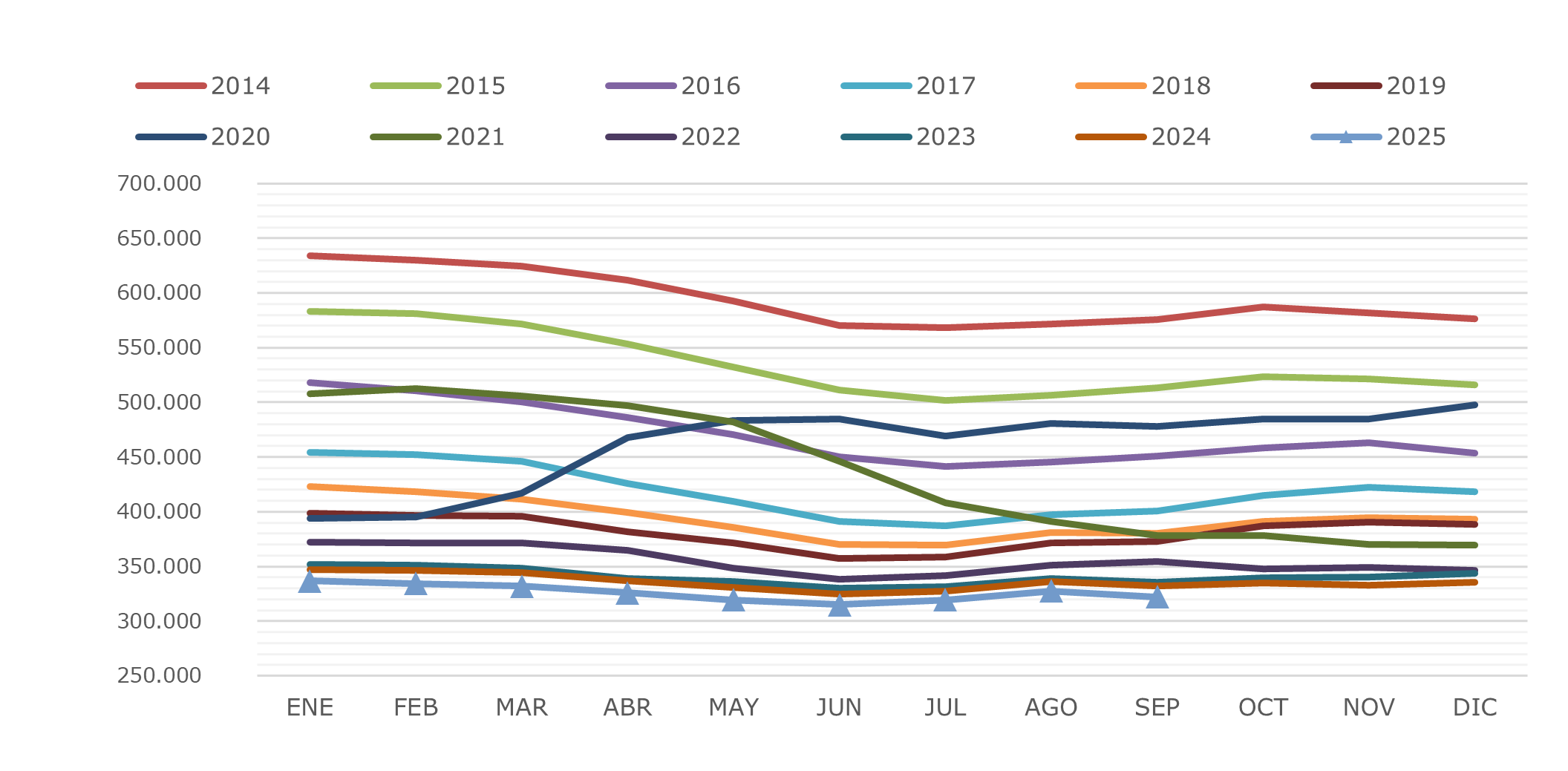 A nivel estatal el paro registrado se reduce en 4.846 personas en relación al mes anterior (-0,20%). La cifra de paro a nivel estatal se sitúa en el mes de septiembre de 2025 en 2.421.665 personas (-5,97% en términos anuales).