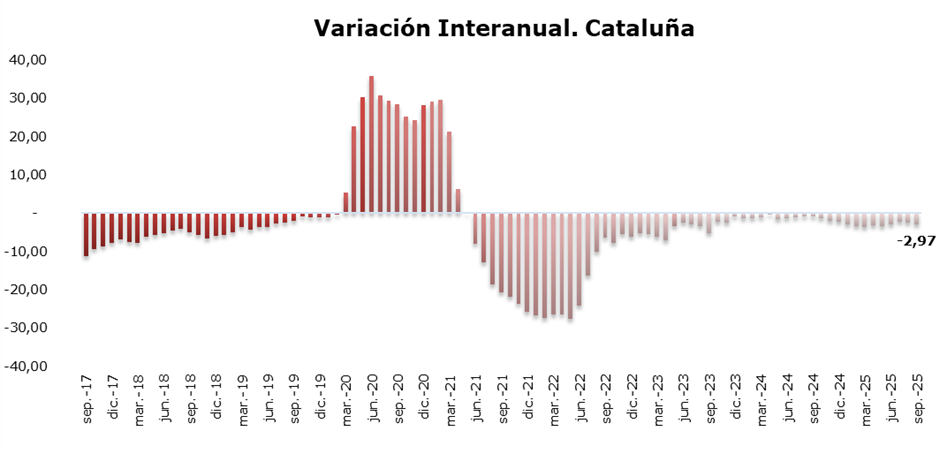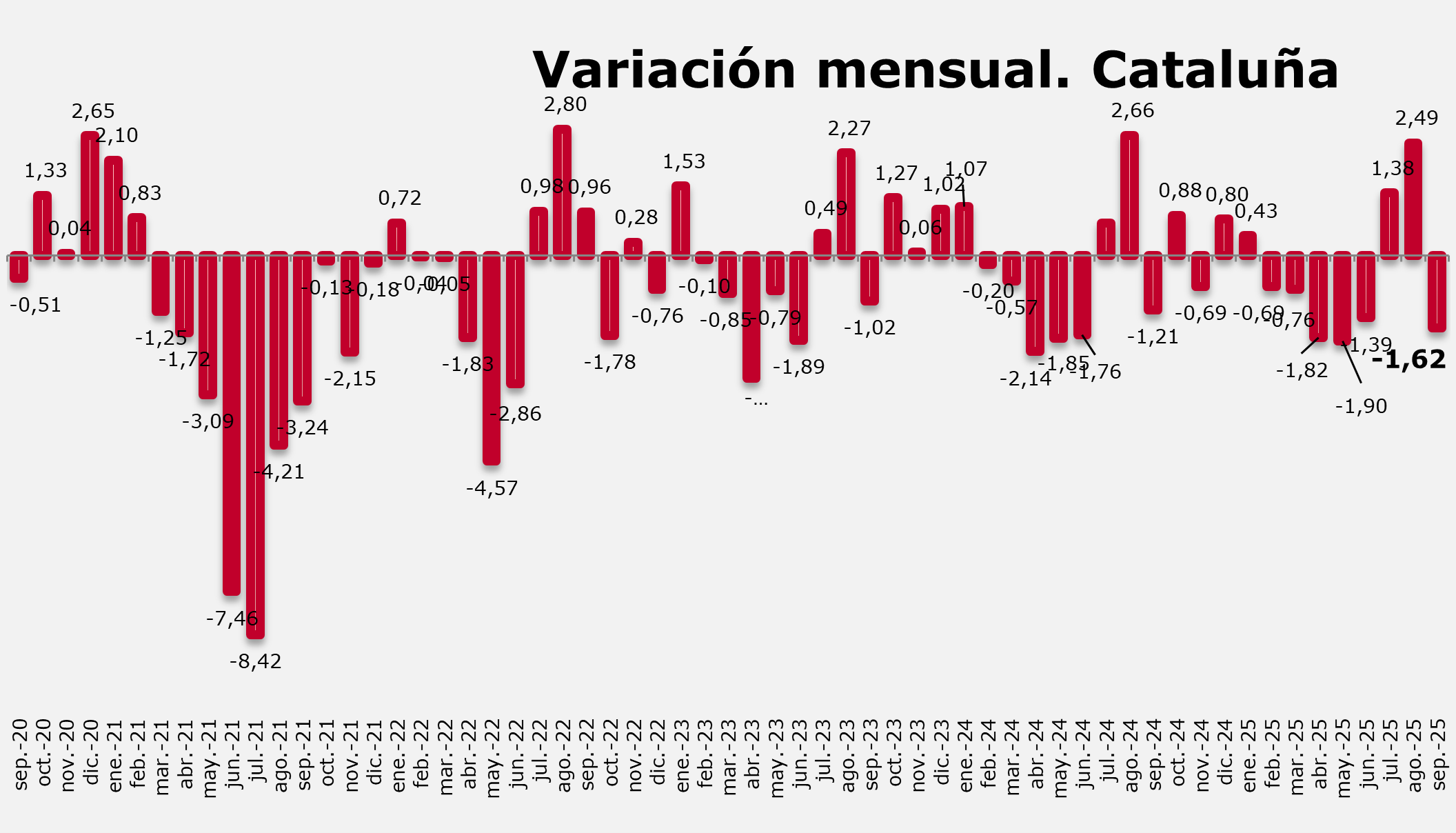En cuanto a la variación mensual, en Catalunya, este mes de septiembre de 2025 el paro ha registrado una reducción de 5.293 personas desempleadas respecto al mes anterior (un -1,62% en términos relativos).