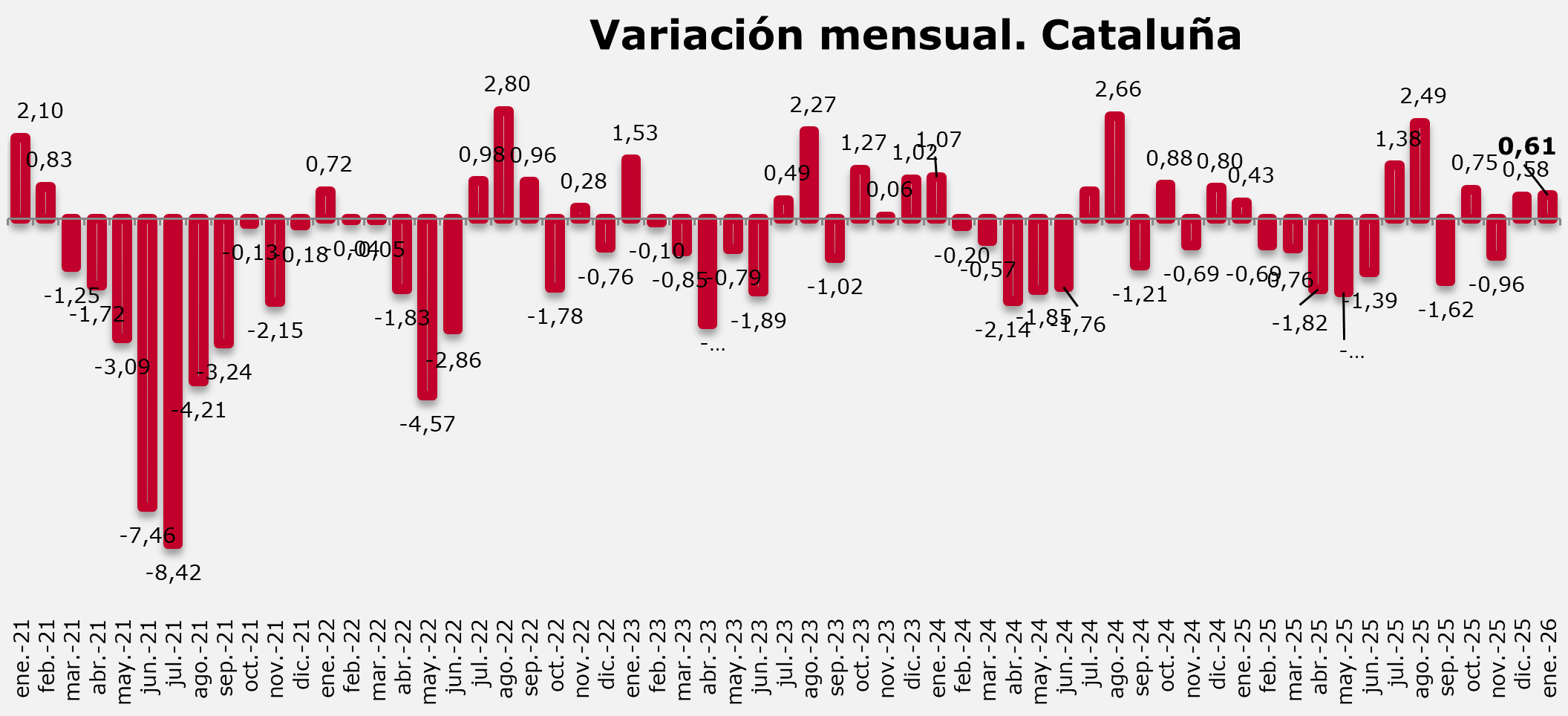 En cuanto a la variación mensual, en Catalunya, este mes de enero de 2026 el paro ha registrado un incremento de 1.978 personas desempleadas más respecto al mes anterior (un incremento del 0,61% en términos relativos).