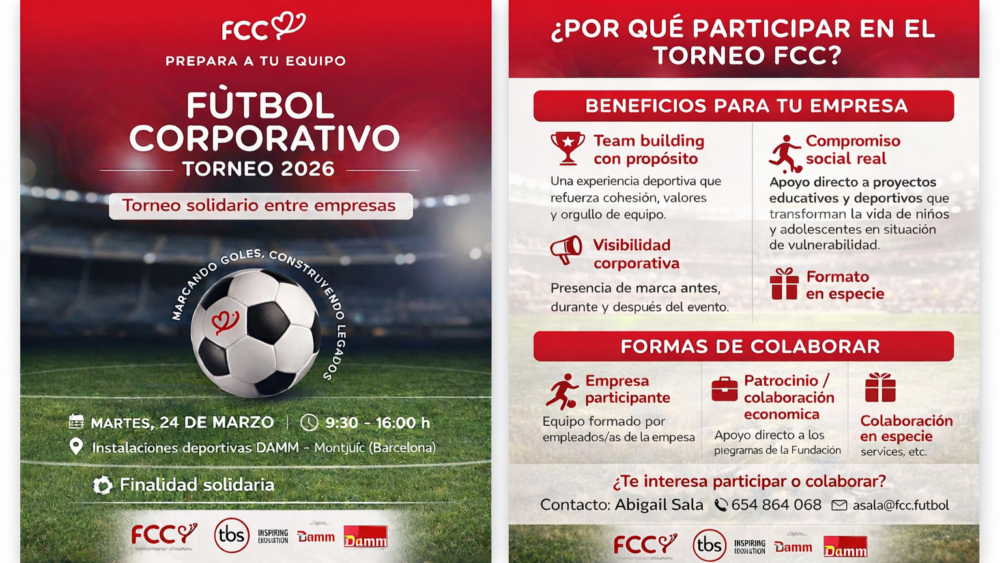 Foment del Treball convida les empreses a participar en el Torneig Solidari de Futbol Corporatiu 2026, una iniciativa organitzada per la Fundació Fútbol con Corazón Espanya que tindrà lloc el proper dimarts 24 de març a les instal·lacions esportives de la Ciutat Esportiva Damm (Montjuïc, Barcelona).