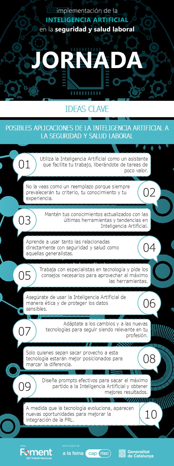 Las intervenciones de los ponentes nos han permitido conocer los conceptos básicos de la IA, sus posibles usos en la prevención de riesgos laborales y su capacidad para potenciar las habilidades y capacidades de los profesionales del sector. Además, hemos visto su aplicación en alguna organización, lo que permitirá conocer de primera mano cómo estas herramientas innovadoras están impactando en la gestión preventiva de las empresas.