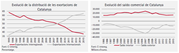 - Las empresas catalanas, en los últimos 20 años, han pasado de exportar al exterior un 36,5% en 1995 a hacerlo un 62,3% en 2015