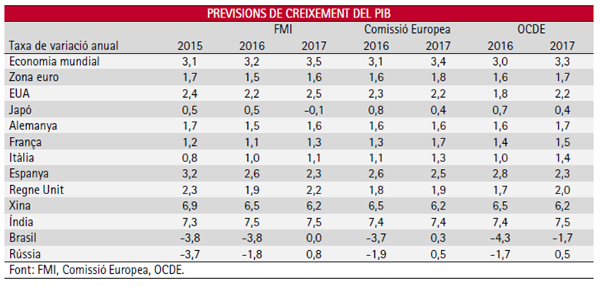 La economía catalana y el global del español mantienen la buena dinámica iniciada en el año 2014, a pesar de las señales de desaceleración que mostraban algunos indicadores a principios de año, la incertidumbre en el contexto internacional y la interinidad política e institucional de los últimos meses. Concretamente, en el ámbito doméstico, se está a la espera de que el riesgo político se disipe en los próximos meses con la conformación de un gobierno estatal que dé continuidad a las reformas ya la consolidación del déficit en un contexto de elevado endeudamiento público.