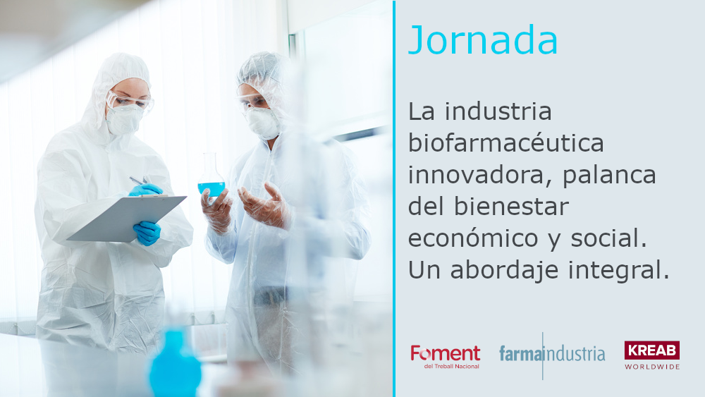 Jornada 29 de març. La indústria biofarmacèutica innovadora, palanca del benestar econòmic i social. Un abordatge integral. Foment del Treball, Farmaindústria i Kreab.