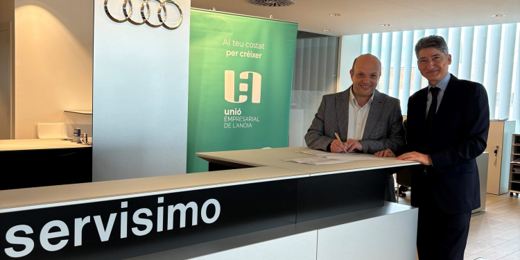 Aquest dimarts dia 26 de març de 2024, el gerent del concessionari Servisimó -que aglutina les marques Volkswagen, Audi i Skoda-, Francesc Pua; i el president de la Unió Empresarial de l’Anoia, Joan Mateu, van renovar l’acord de col·laboració per plasmar la ferma aposta per la competitivitat del territori i del seu teixit empresarial.